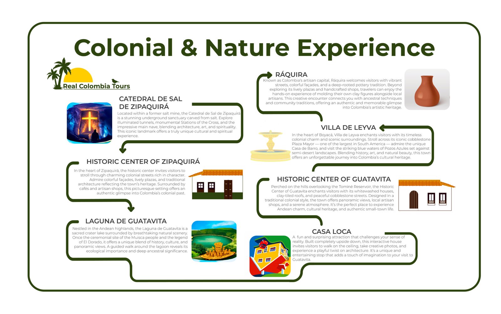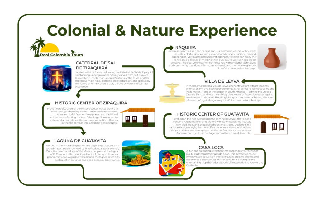 Discover the cultural and natural treasures of Zipaquirá and Guatavita on a journey through history, legend, and breathtaking landscapes. From the awe-inspiring Salt Cathedral carved deep underground to the sacred waters of the Guatavita Lagoon, this tour blends heritage, spirituality, and Andean beauty in one unforgettable experience. Walk through charming colonial streets, explore iconic landmarks, and connect with the stories that shaped the legend of El Dorado. Let Zipaquirá and Guatavita captivate you at every step. Immerse yourself in the timeless charm of Villa de Leyva through its colonial history, cultural heritage, and stunning landscapes. From the iconic Plaza Mayor to nearby natural wonders, this experience blends tradition, architecture, and scenic beauty. Stroll its historic streets and uncover the stories that make this town one of Colombia’s most treasured destinations.